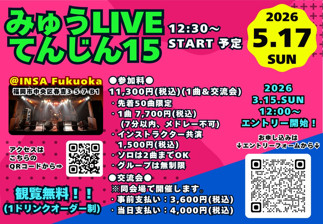 天神校 発表会ライブ『みゅうLIVEてんじん15』を開催いたします!!