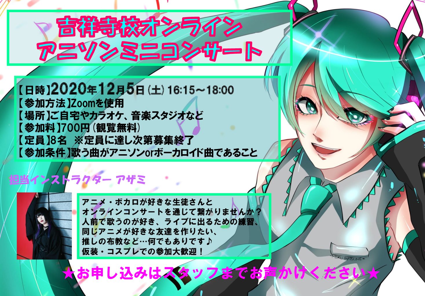 blog, 吉祥寺校 投稿日:2020年12月8日こんにちは、吉祥寺校のアザミです。 12月5日に開催したオンラインアニソンミニコンサートが終了しまし[…]